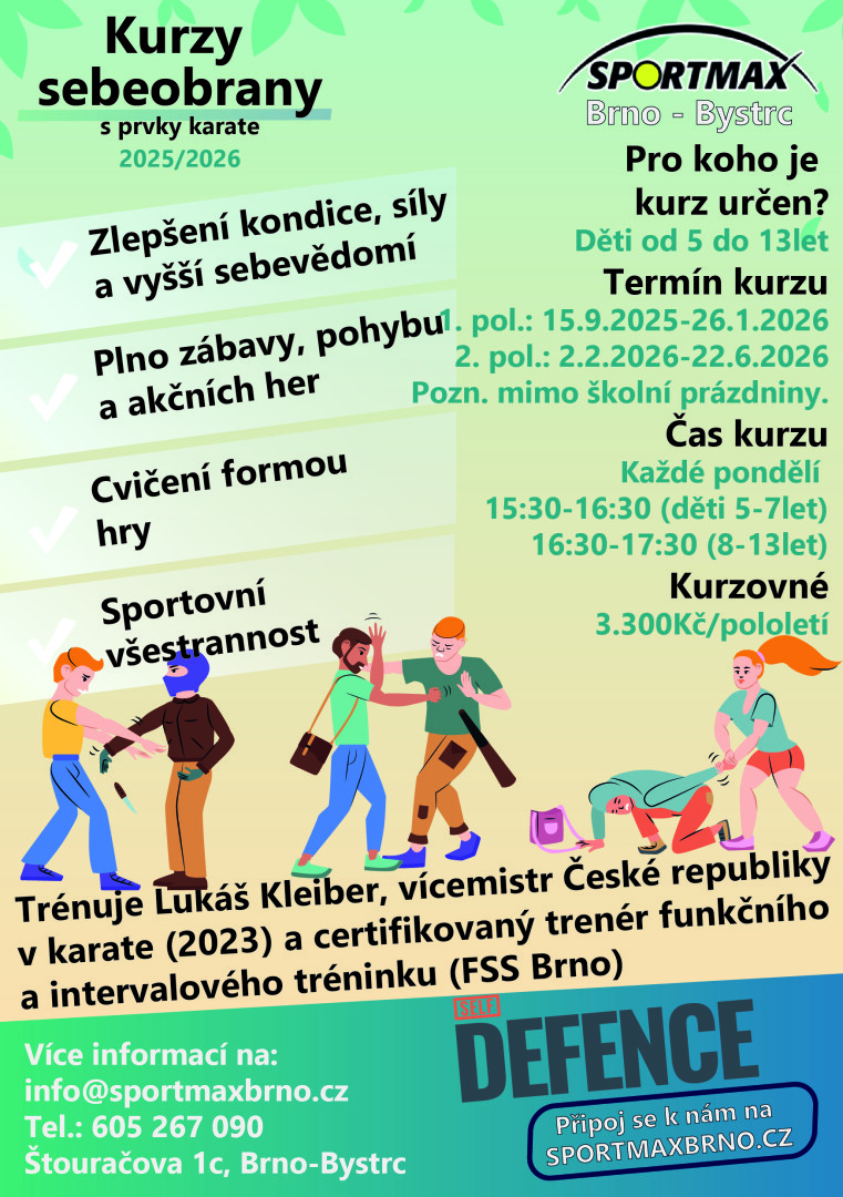 - Kurz sebeobrany s prvky karate (PO 15:30-16:30 pro děti 5-7let a PO 16:30-17:30 pro děti 8-13let )